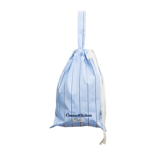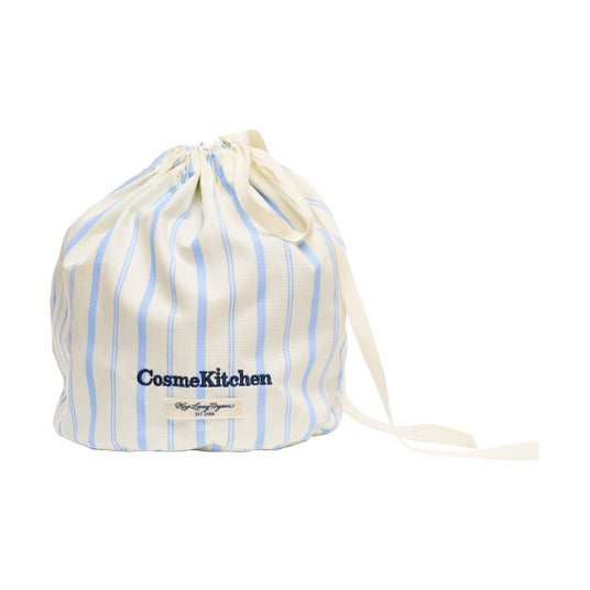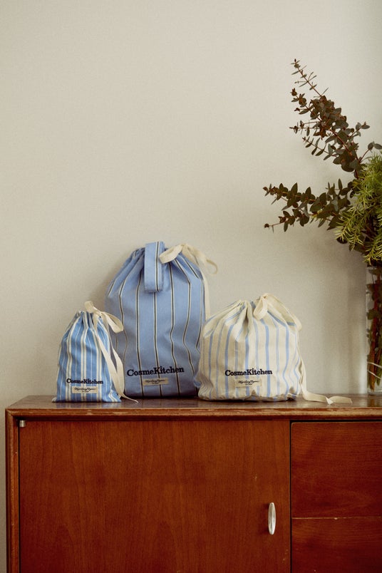 巾着には、スタンダードで長く愛されているストライプ柄を採用。ブルートーンのCosme Kitchenオリジナル“コスキチストライプ”をあしらい、自分用としてはもちろん、贈り物を大切に包みながら、もらった後も使い続けられるような、日常の溶け込むデザインに仕上げました。