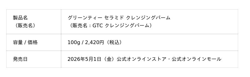 アモーレパシフィックジャパン株式会社(本社:東京都渋谷区)が展開する、自然主義アクティブスキンケアブランド [INNISFREE | イニスフリー]は、ブランドを代表するグリーンティーラインから、独自の高純度グリーンティーセラミド*¹を配合した『グリーンティー セラミド クレンジングバーム』を、2026年5月1日(金)より公式オンラインストア・公式モールにて発売いたします。