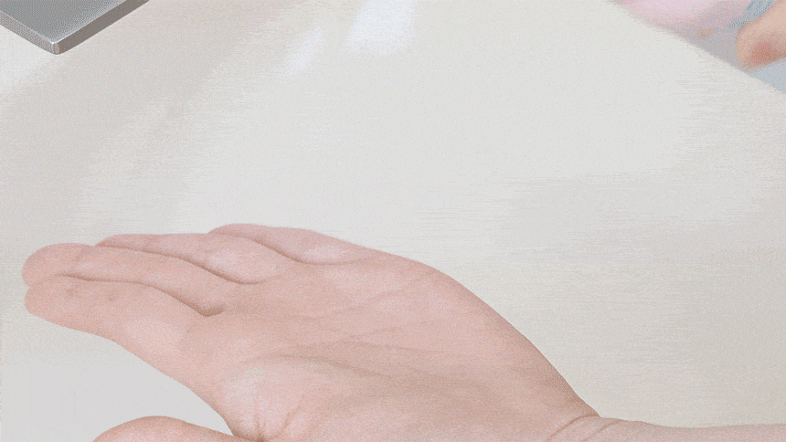 スプレー⽸を2~3回振り、手のひらにコットン泡を噴射し、手のひらで形を整えます。