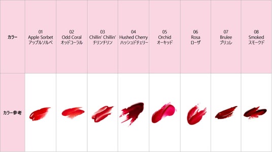 – ジューシーな果実からインスピレーションを得たブライトトーンの生き生きとしたカラーが唇に密着し、グレイズ立体コーティング完成。