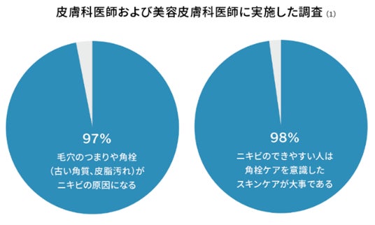 皮膚科医師および美容皮膚科医師に実施した調査(1)において、97%の医師が『毛穴のつまりや角栓(古い角質、皮脂汚れ)がニキビの原因になる』と考えています。