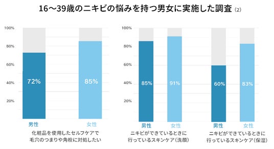 また、ニキビができている時のスキンケアは、『洗顔』(男性85%、女性91%)と『保湿ケア』(男性60%、女性83%)が上位に挙がりました。