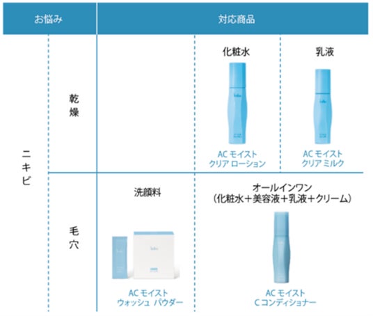 ニキビと乾燥、ニキビと毛穴といった肌悩みに合わせた選択が可能となり、