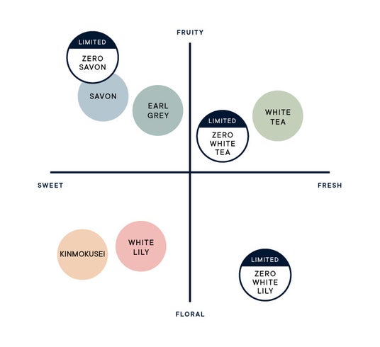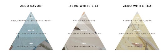 左から『ゼロサボン』、『ゼロホワイトリリー』、『ゼロホワイトティー』