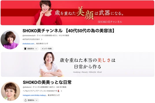 「SHOKO美チャンネル」(登録者数40万人※1/15現在)は、現在54歳の現役ヘアメイクアップアーティストSHOKOが配信するYouTubeチャンネルで、40代50代の女性がキレイになることで自信を取り戻し、元気で笑顔あふれる高齢化社会実現のために、「40代50代だからこそ」の正しいお手入れや年齢に合わせた美容法を紹介しています。
