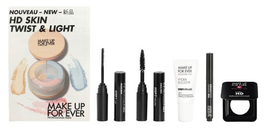 サンプル 左から:HDスキン ツイストライト/プロフェッショナルマスカラ/ステップ1プライマー ハイドラブースター/アクアレジスト グラフィックペン/ウルトラHDプレストパウダー