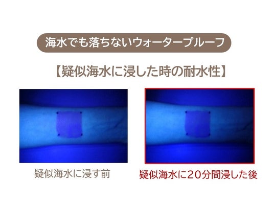 UVカメラを使用して、疑似海水に濡れた肌の耐水性を確認。その結果、疑似海水に浸す前後の検体残留量に違いは見られず、「ママ&キッズ パーフェクトサンスクリーン」は海水に浸しても落ちないことが分かりました。また濁度およびpH値の測定でも値の大きな増減は見られず、海水を汚さないことがわかりました。