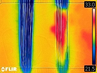 サーモグラフィー比較(左:水のみ、右:アンウルトリートメント塗布から10秒後)