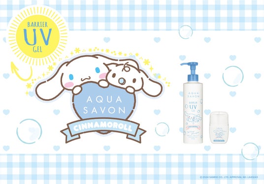 2020年から4年連続でサンリオキャラクター大賞 第1位を獲得した大人気キャラクター「シナモロール」と、みずみずしい使い心地と清潔感のあるシャボンの香りが好評の「アクア シャボン バリアUVジェル」がコラボレーション。パッケージは、爽やかなブルーのチェック柄にシナモロールとお友だちのみるくが小さいハートとシャボンに囲まれた可愛い特別デザインです。パッケージと本体ボトルとで異なるイラストが描かれており、日々のUVケアを楽しめるようにデザインにこだわりました。