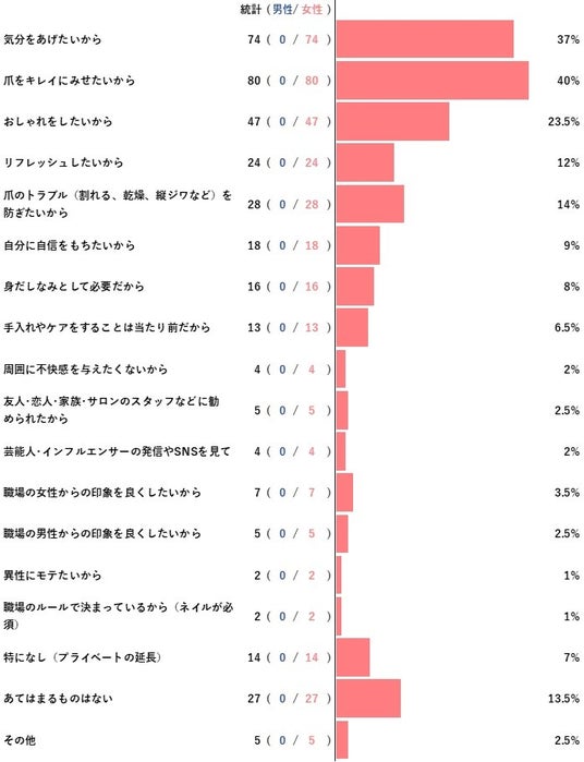 お肌の色にも馴染みやすく、あまり目立たないカラーが人気のようです。理由としては『爪を綺麗に見せたい』『気分をあげたい』が上位に来ており、きちんとおしゃれをして自分自身に磨きをかけた上で仕事に望みたい、と考えていることがわかります。