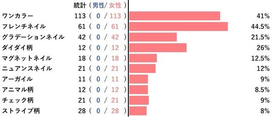 「職場でやってみたいネイルデザインをお選びください」というアンケート調査の結果、1位は『ワンカラー』でした。1位:ワンカラー2位:フレンチネイル3位:グラデーションネイル4位:ストライプ柄5位:チェック柄5位:ニュアンスネイル「職場でやってみたいネイルカラーはどれですか?」