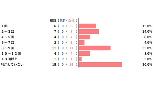 「ネイルサロンを利用したことはありますか?」とアンケート調査をした結果、多数回答は『ない』でした。1位:ない2位:ある「 直近1年間のネイルサロンの利用回数を教えてください」
