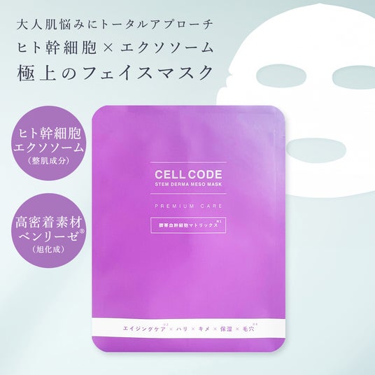 なかでも、セルコードを代表するステムシリーズから、毛穴の目立ち※2やくすみ※3、乾燥など、年齢を重ねたことで起こる肌悩みにアプローチするスペシャルケア成分・臍帯血幹細胞マトリックス-II(臍帯血幹細胞マトリックス-IIとは「ヒト臍帯血細胞順化培養液※4」と「ヒトサイタイ血由来幹細胞エクソソーム※5」などを複合した弊社オリジナル原料のこと)と肌ケア成分(ナイアシンアミド※6、2種のビタミンC誘導体※7、レチノール※8、3種のヒト型セラミド※9)で、大人の欲しいを一度に満たすフェイスマスク「セルコード ステム ダーマメソ マスク」が新登場。2024年2月27日(火)に発売を開始します。