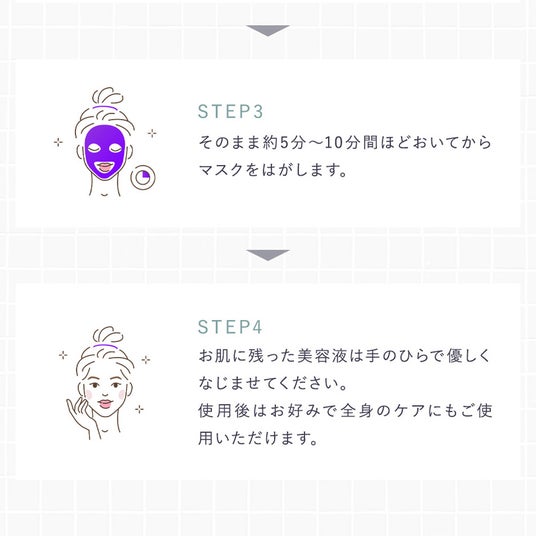 3、5~10分経過したら、マスクをお肌からはずしてください。その後お肌に残った液をよくなじませてください。