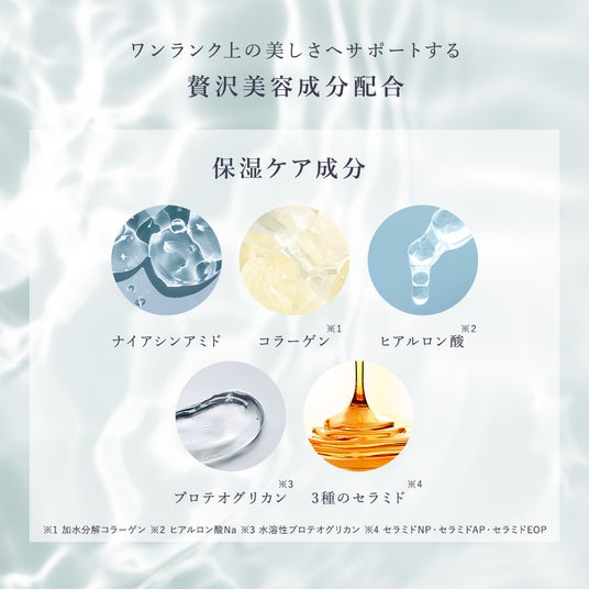 * 1 年齢に応じた肌のお手入れ * 2 肌に潤いを与え、なめらかにすることによる *3 乾燥による *4、*5、*6 ともに整肌成分 *7 アスコルビルグルコシド、APPS:パルミチン酸アスコルビルリン酸3Na(整肌成分) * 8 パルミチン酸レチノール(整肌成分) *9 セラミドNP、セラミドAP、セラミドEOP(保湿成分)