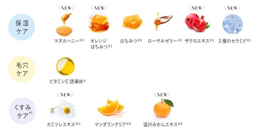 ※テトラヘキシルデカン酸アスコルビル(整肌成分) ※1保湿成分 ※2保湿・エモリエント・皮膚コンディショニング成分の合計、水を含む ※3整肌成分 ※4マンダリンオレンジ果皮エキス(整肌成分) ※5ウンシュウミカン果皮エキス(整肌成分)*当社従来品比 *1古い角質や汚れ *2うるおった肌印象のこと *3化粧品効能による、年齢に応じたお手入れ