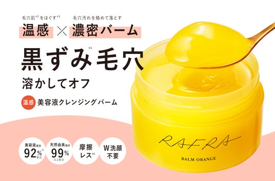 じんわりとろける+8℃*1の温感バームが固くこわばった肌をほぐし*2、毛穴汚れやメーク、くすみ*3まですっきり落とす、ラフラ人気No.1*の『バームオレンジ』。美容液で洗うという発想のもと、オイル級に優れたクレンジング力と、美容液パック後の肌のようなうるおい感を両立させています。