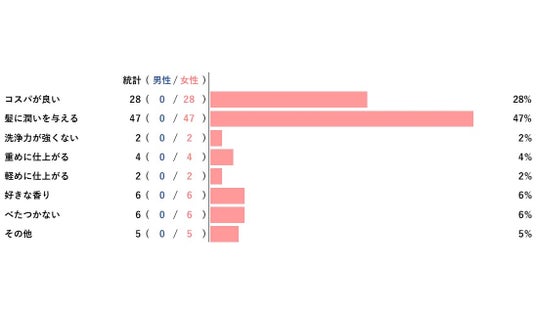 また、その理由は『髪に潤いを与える』でした。うねりやくせ毛の人は単にさらさらヘアーになればいいというものではなく、潤いを与えることでハネやクセを抑えようと考えているようです。そしてもちろんコスパは大事!