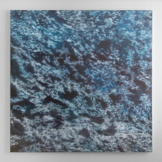 この没入的空間の探究は、青のシリーズ(2017年~)より始まりました。制作の際、「“青”という語で表現され得る色」のみ用いるという縛りによって、繊細な色のスペクトラムの探究が求められたことで、高屋は自ら色材を練って画材を作り始めます。