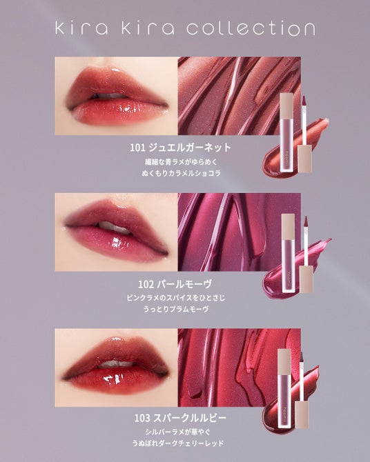「Kira Kira Collection」はhaomii初のラメ入りリップティント。これまでのリップティントのうるおい感、ティント力はそのまま、より濃いカラー展開(全3色)で、大人レディなリップコレクションとなっています。