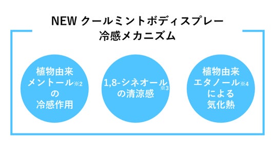2023年まで製造していた『クールミントボディミスト(従来品)』は、ハッカとペパーミントの精油中に含まれる香気成分※3のメントール※2が配合されていましたが、今回のリニューアルで、さらに植物由来のメントール※2を追加配合しました。
