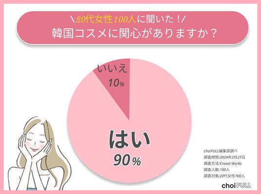 20代女性100人に韓国コスメに関心がありますかと聞いたところ、「はい」と回答した人が9割いました。そのように回答したのは、以下の理由が挙げられます。