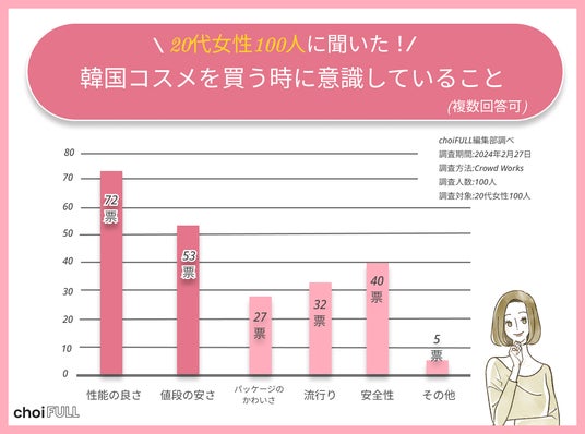 20代女性100人に韓国コスメを買う時に意識していることを聞いたところ、7割以上が「性能の良さ」と回答。また、5割以上が「値段の安さ」という結果になりました。