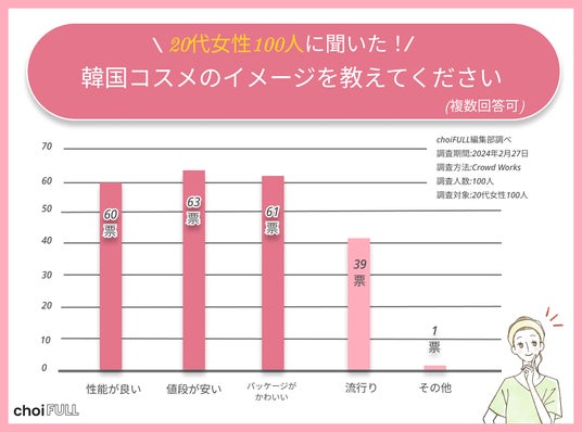 20代女性100人に韓国コスメのイメージを聞いたところ、約6割が「値段が安い」と回答。さらに、同じく6割が「パッケージがかわいい」「性能が良い」と回答しました。