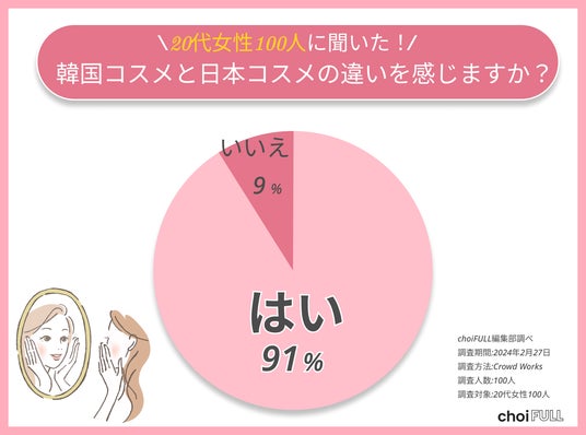 20代女性に韓国コスメと日本コスメの違いを感じますかと聞いたところ、9割以上の人が「はい」と回答しました。