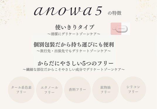 anowa5 Dジェルは、「ドクターズコスメティクス」をコンセプトに開発されたデリケートゾーン保湿ジェル、anowa41 Dジェル(医療機関専売品)の姉妹品です。デリケートゾーン保湿ジェルをより多くの方々に広めたいという思いから、2022年より一般消費者向けの商品として「anowa5 Dジェル」が誕生いたしました。anowa5 Dジェルはデリケートゾーンの乾燥、かゆみなどにアプローチする商品で、皮膚に潤いを与え、柔軟性を保ち、不快症状を軽減します。近年ではVIO脱毛後の乾燥対策など幅広い年齢の方にご支持いただいています。