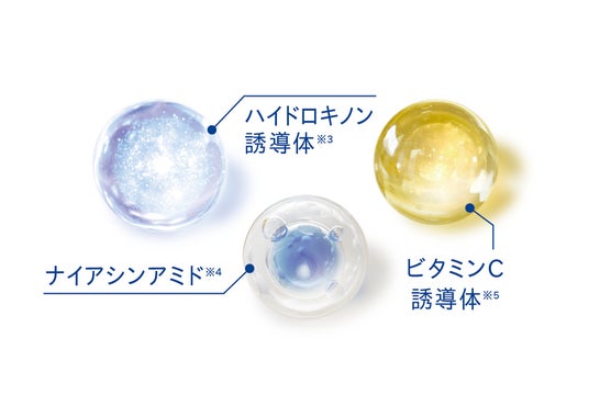 「ハイドロキノン誘導体」(*3)をはじめ「ナイアシンアミド」(*4)や「ビタミンC誘導体」(*5)を配合し、 シミを防いで素肌の明るさを守り抜きます