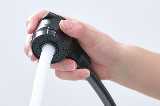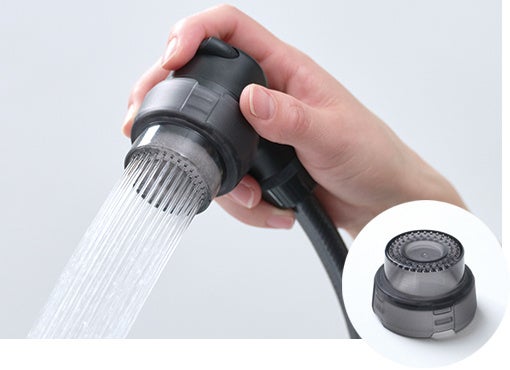 節水機能はそのままに、手の小さい方でも握りやすいよう小型化。ネープに入れやすく、泡沫とシャワーを切り替えて使用することで、効率よく洗い流すことができます。
