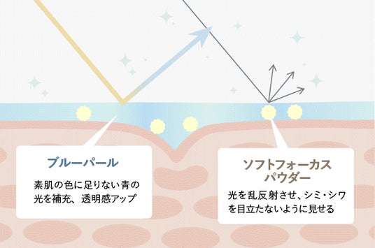 光をコントロールする2種類のパウダー*2が、素肌のトーンや毛穴・シミを補正し、明るくキメの整った肌に仕上げます。また、ブルーベースやイエローベースなど、どんな肌色にも自然に馴染みます。
