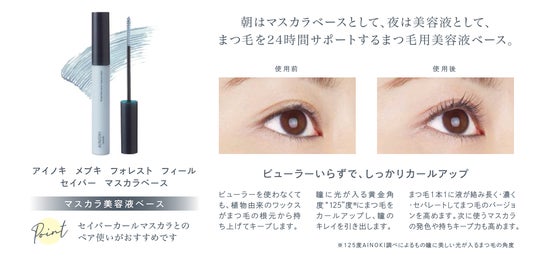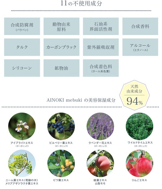 「AINOKI mebuki」の製品には、いきいきとした目元へと導くために厳しい自然環境の中で育まれた植物成分が欠かせません。「輝く瞳」と名付けられたアイブライトエキス*1は、目の疲れや痛み、炎症への効果が期待されています。ブルーライトから目元を守ってくれるビルべリー葉エキスや毛髪を健やかに導くビワ葉エキスや桃葉エキスを配合。また、厳選したオーガニック成分で、地球にも肌にも優しさを大切に考えています。デイタイムのメイク中こそ、ナチュラルオーガニックで、肌を潤いでみたし、外的環境から守りながら、健やかな状態へと導くサポートをします。