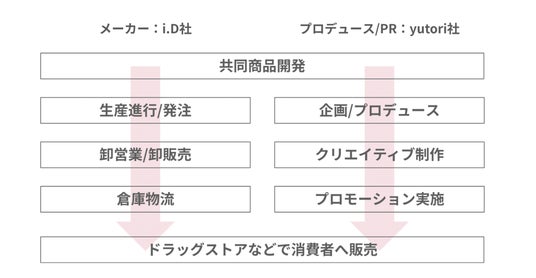i.D社がメーカーとして商品の生産や、ドラッグストアを中心とした卸の流通を担い、yutoriはプロデュース(商品の企画とプロモーション)を担います。卸売上の一定割合をレベニューシェアで収益分配をする契約となっています。