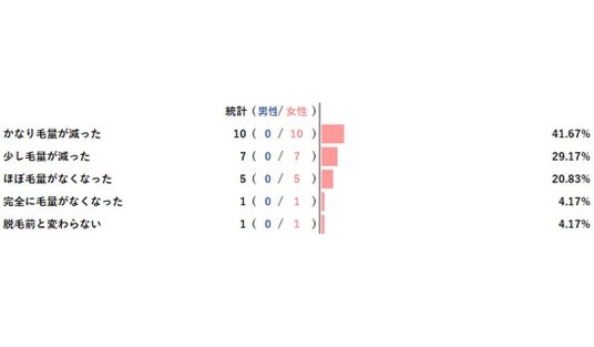 次に「脱毛の効果を教えてください」とアンケート調査をした結果、1位は『かなり毛量が減った』でした。1位:かなり毛量が減った2位:少し毛量が減った3位:ほぼ毛量がなくなった4位:完全に毛量がなくなった4位(同率):脱毛前と変わらない「VIO脱毛への満足度について教えてください」