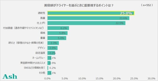 ●美容師がドライヤーを選ぶときに重要視するポイントは、「速乾性」「風量」「仕上がり」