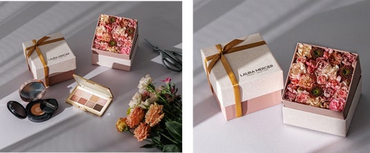 LAURA MERCIERのオリジナルボックスに、春の柔らかな印象を感じる花々を詰めた自分だけのフラワーボックスを制作。
