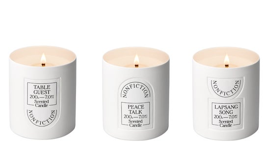 「ノンフィクション」センテッドキャンドル(テーブルゲスト・ピーストーク・ラプサンソング、各200g)各10,120円 [HANKYU BEAUTY 先行販売]
