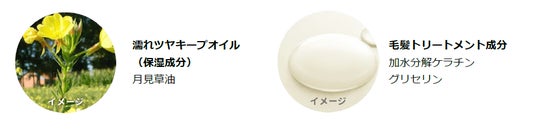 濡れツヤキープオイルとして、月見草油(保湿成分)を配合。また毛髪トリートメント成分として加水分解ケラチン、グリセリンを配合しています。
