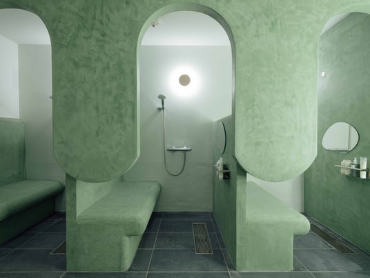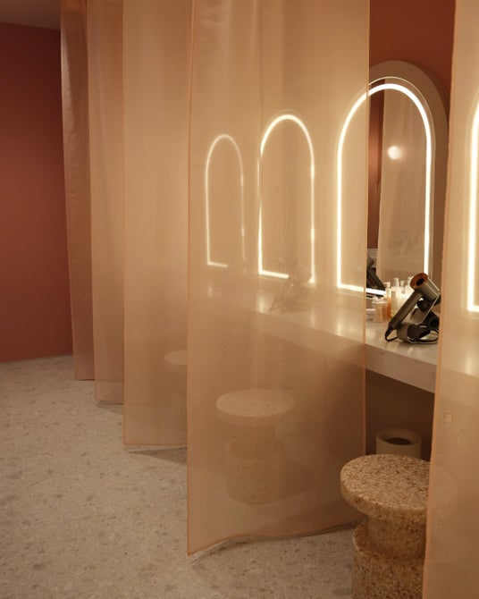 オーガンジーがたなびくピンクのパウダールームで、アフターサウナの優雅な時間