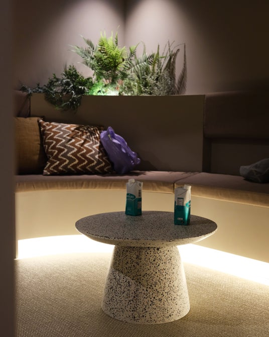 ほの暗いライティングが心地よくリラックスできる、リラクシングエリアNEST