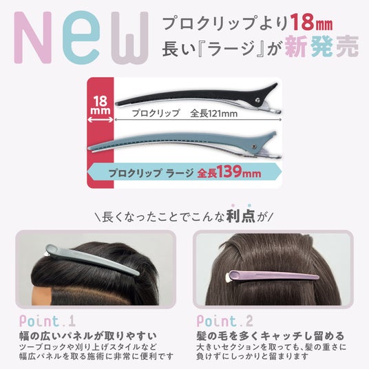 株式会社トリコインダストリーズ(本社:大阪市浪速区、代表取締役社長:村島有治)は、2024年5月1日、同社オリジナルブランド「アイビル」から、一気にしっかり留まるダッカール「アイビル プロクリップ ラージ」を発表します。既に発売しているアイビル プロクリップより18mm長くなり新発売。カラーは、ストーングレー/ライラック/チョークホワイト/アイスグレーの4色展開です。クリップ部分が長くなったことで、幅の広いパネルが取りやすく、多毛もしっかりキャッチして留めることができます。頭の形に沿った緩やかなカーブで外れにくく、しっかり留まるのに跡がつきにくいというのもポイント。機能性&見た目の両方にこだわりを持ったダッカールです。