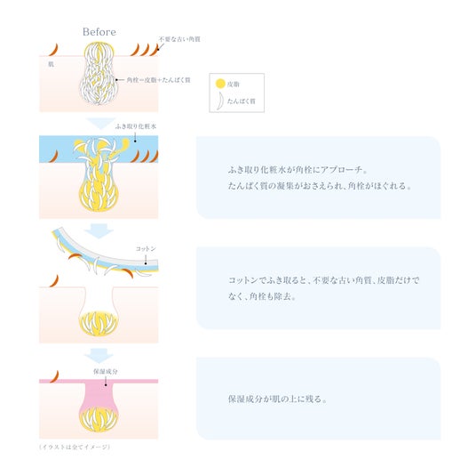肌をやさしくふき取ることによって、不要な古い角質、肌表面の皮脂、毛穴づまりの原因の一つである角栓までも除去することが可能です。さらに毛穴汚れをふき取ると同時に、肌にうるおいを与える役割も両立し、しっとり透明感のある“うるピュア肌”へと導きます。