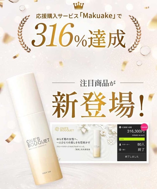 2024年3月29日(金)~4月29日(月)の期間中に実施した、応援購入サービスMakuakeでは 予想を大きく上回る達成率316%、延べ80名のサポーター様よりご支援いただき、発売前からの注目度の高さがうかがえる結果となりました。より多くの方に実感いただきたく、M&Hラボサイトにて一般販売を開始いたします。