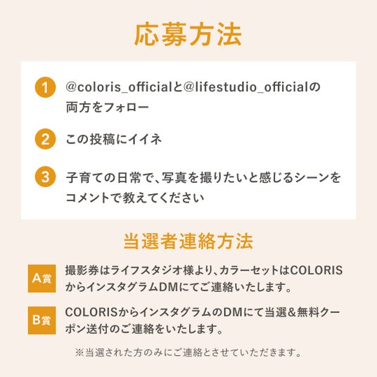 1.インスタグラム @coloris_officialと@lifestudio_official 両方をフォロー