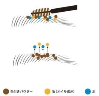 POINT1:塗った直後からパウダーに!マスカラを塗布すると、液体は瞬時に揮発して、色つきパウダーだけが肌に残る、驚き発想!眉毛にベッタリと液がつくことはなく、パウダーメイクをしたようなふんわり眉に仕上がります。地肌についてしまっても大丈夫!眉のないところに塗っていただいても大丈夫です。
