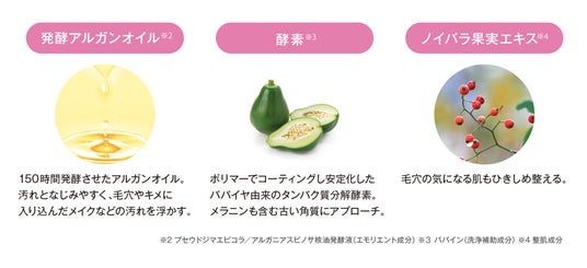 美容成分として、発酵アルガンオイル※1や異性化糖※2、吸着型ヒアルロン酸※3を配合したオイルジェルタイプのクレンジングです。弾力のあるジェル状が、エステティシャンのような摩擦レスなタッチでメイク汚れに密着。その後、オイル状、ミルク状※4へと変化し、メイク汚れをしっかり落としながらも、しっとりなめらかな肌に洗い上げます。