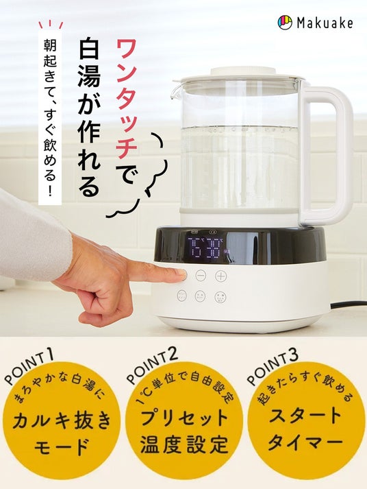 – タイマー機能: 就寝前にセットしておけば、朝起きたときにすぐに飲める白湯が用意されています。