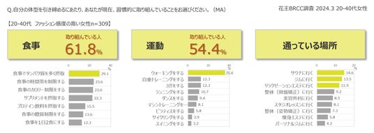 ●“ファッション感度の高い女性”がファッションを楽しむために習慣的に取り組んでいることは、食事61.8%、運動54.5%。